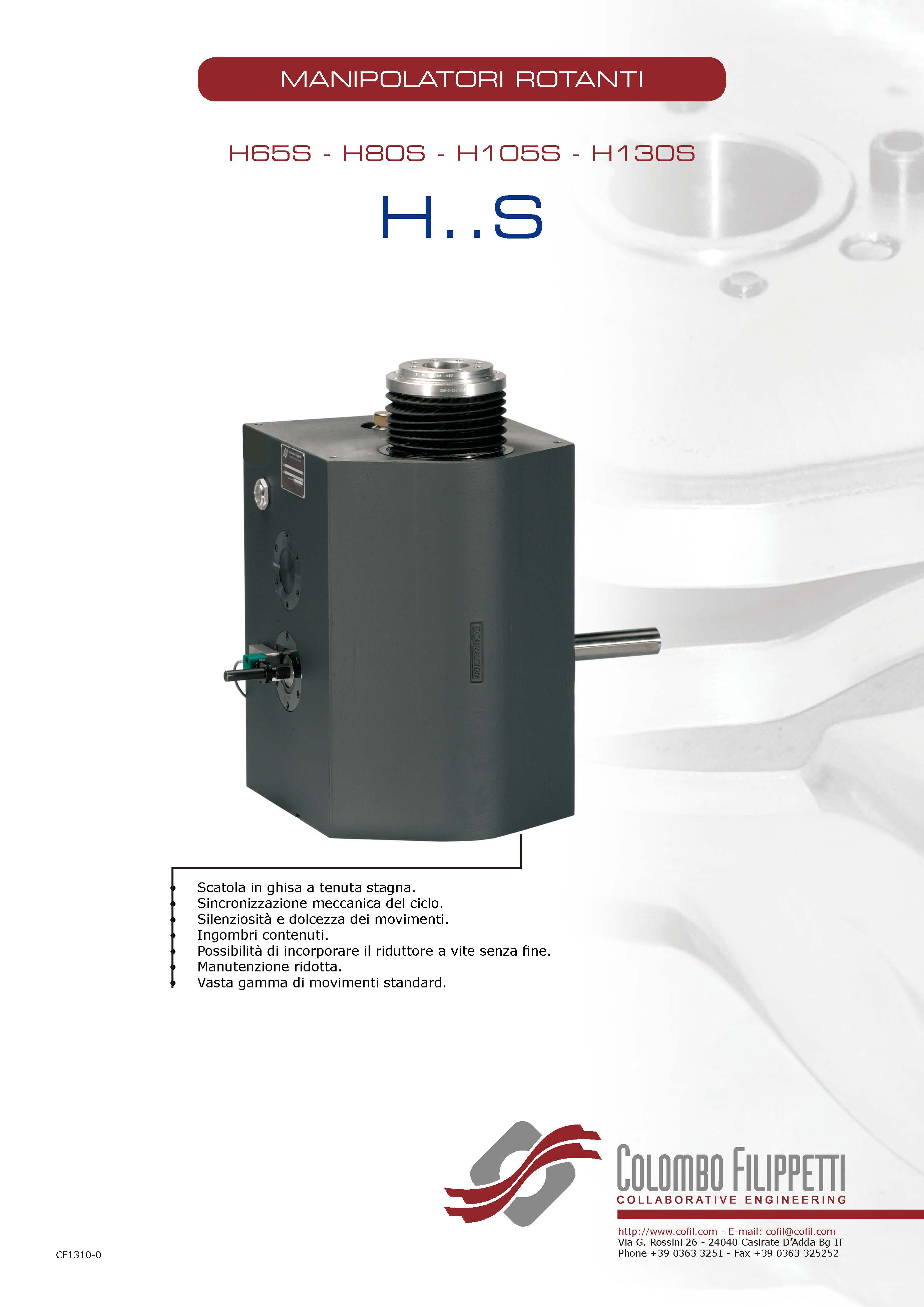 COLOMBO FILIPPETTI spa的H..S系列旋轉(zhuǎn)機(jī)械手是共軛雙凸輪機(jī)構(gòu),將輸入的勻速旋轉(zhuǎn)運(yùn)動(dòng)轉(zhuǎn)換為旋轉(zhuǎn)取放的典型運(yùn)動(dòng),即旋轉(zhuǎn)間歇運(yùn)動(dòng)和線(xiàn)性交替運(yùn)動(dòng)。